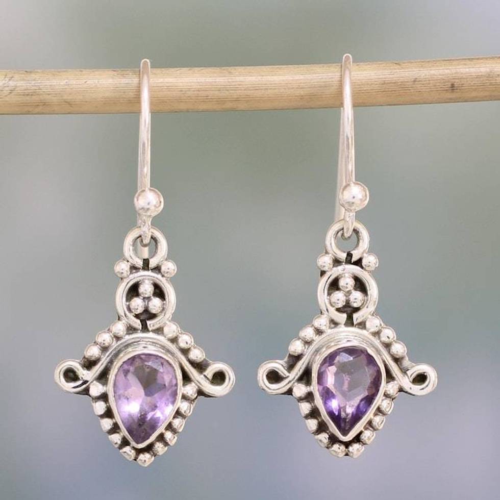 Amethyst and Sterling Silver Teardrop Earrings from India 'Dotted Delight' Item ID: 2676664014