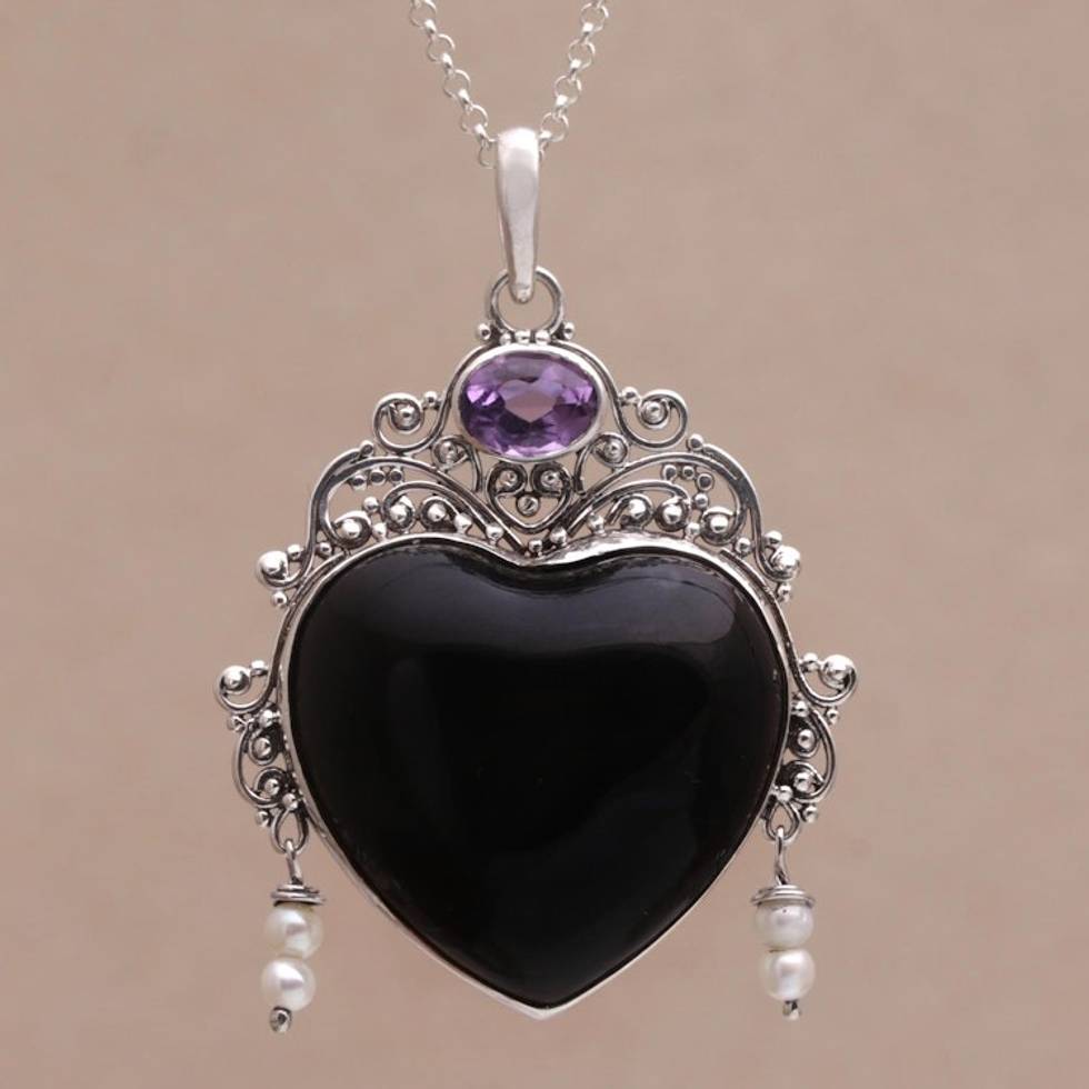 Amethyst Cultured Pearl Silver Black Bone Heart Necklace 'Love Like Midnight' Item ID: 2669921909