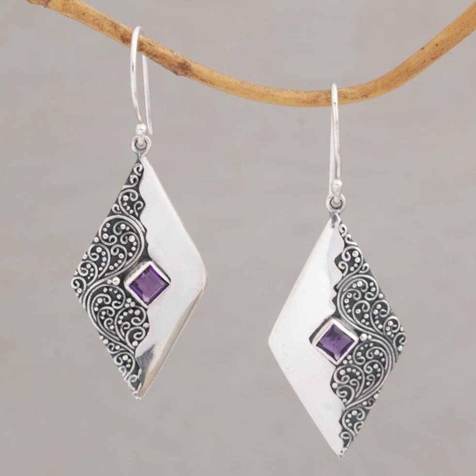 Amethyst Diamond-Shaped Dangle Earrings from Bali 'Diamond Ferns' Item ID: 2669922967