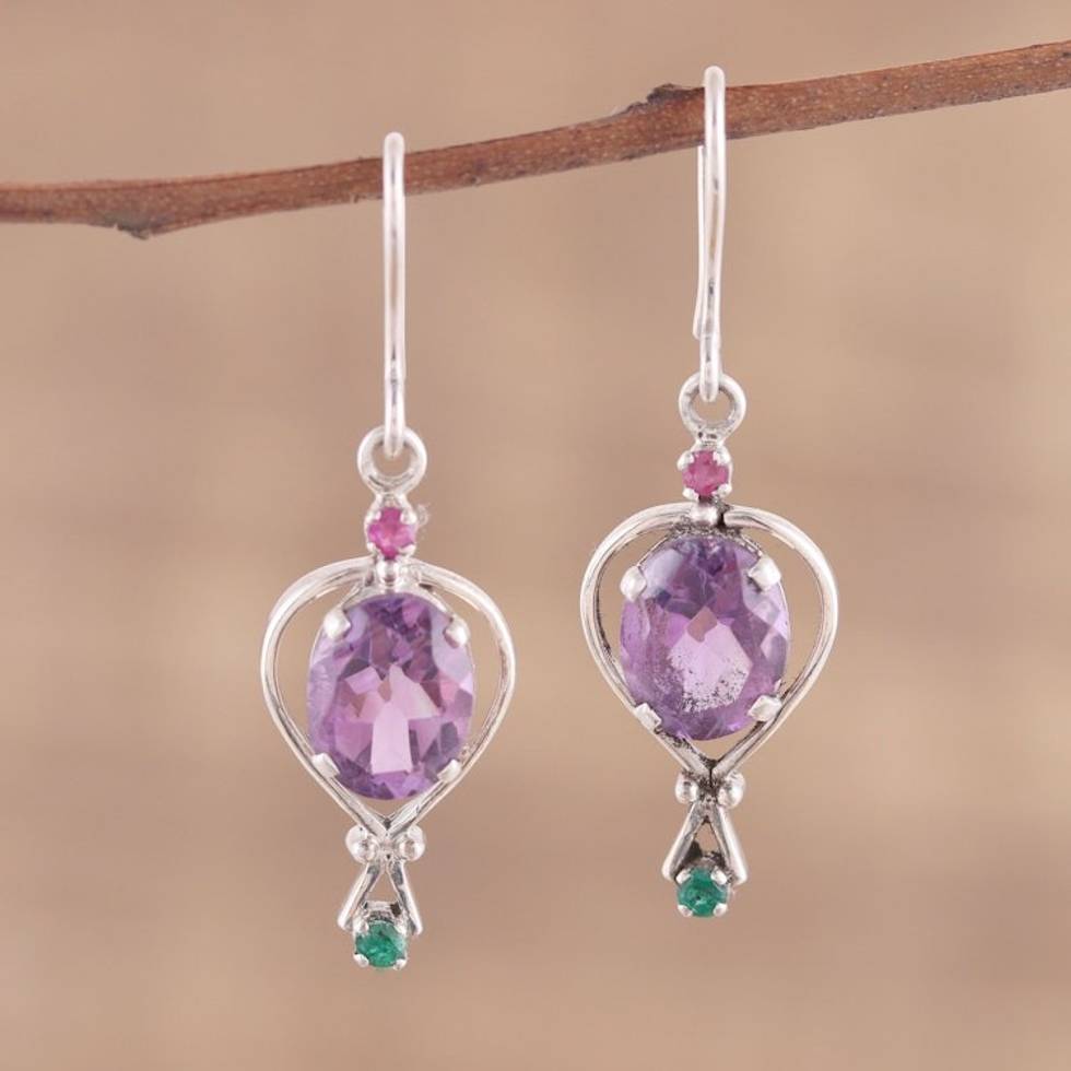 Amethyst Emerald and Ruby Dangle Earrings from India 'Sparkling Allure' Item ID: 2669942927