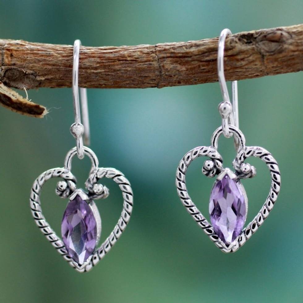 Amethyst Heart Earrings in Sterling Silver from India 'Mystic Love' Item ID: 2671795008