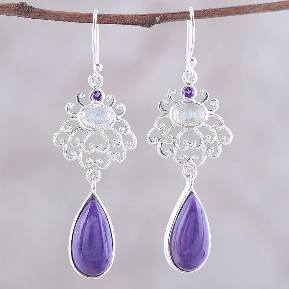 Amethyst Labradorite and Charoite Sterling Dangle Earrings 'Harmonious Purple Trio' Item ID: 2671792567