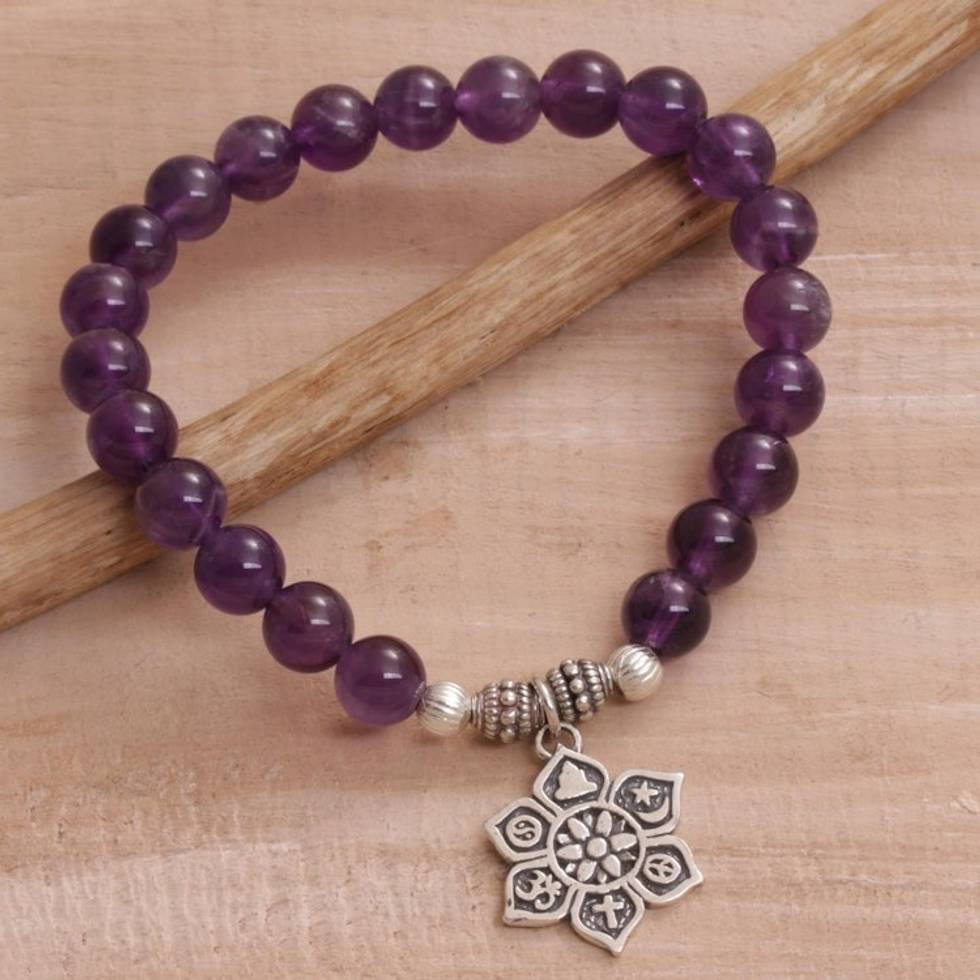 Amethyst Religious Beaded Stretch Bracelet from Bali 'Unity Flower' Item ID: 2669923283