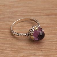 "3.5 carats of faceted amethyst glisten in this elegant cocktail ring from Bali. Handcrafted from sterling silver, artisan Lenny uses time-honored techniques that have been refined over two decades of silver-smithing to create the pretty floral vine motifs that surround the opulent stone. Four drop-shaped accents of shimmering 18k gold accentuate the luxurious allure of the ring."