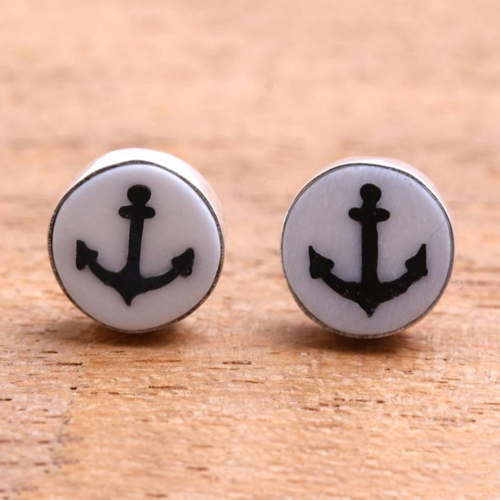 Anchor Motif Bone Stud Earrings from Bali 'Black Anchor' Item ID: 2671736654