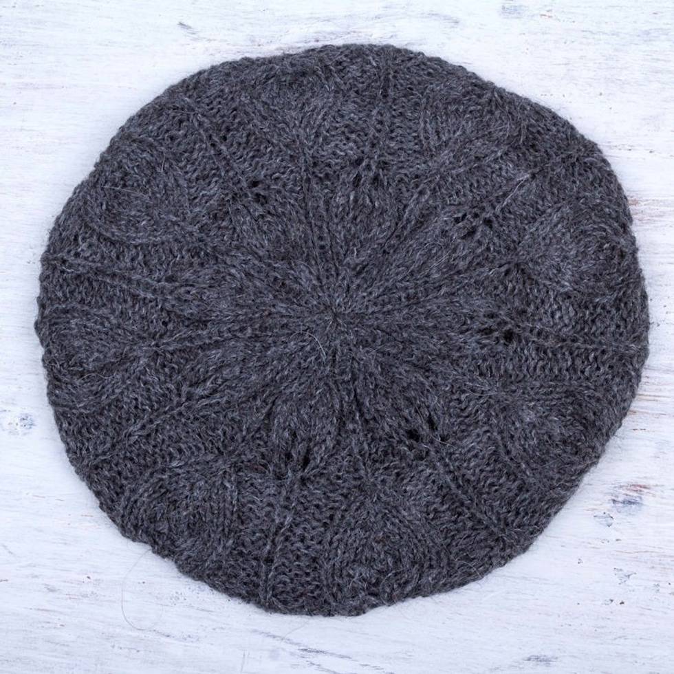 Andean Alpaca Wool Hand Knitted Beret in Charcoal Grey 'Charcoal Grey Leaves' Item ID: 2671820264