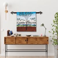 "Silhouetted against the chill blue sky, autumn trees recall summer's bounty, while releasing dried foliage to the earth. Master weaver Luis Leon creates this colorful image the Northern Peruvian countryside with this evocative handwoven tapestry.