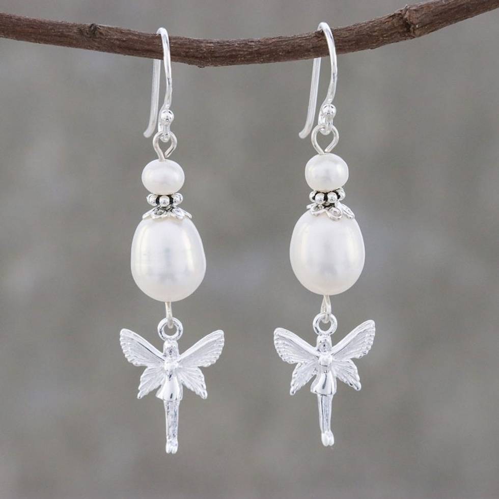 Angel Themed Cultured Pearl Dangle Earrings from Thailand 'My Sweet Angel' Item ID: 2671798352