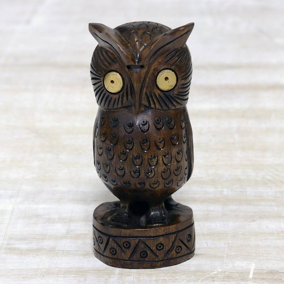 Antiqued Wood Bird Statuette Carved by Hand in India 'Vigilant Owl' Item ID: 2671793413