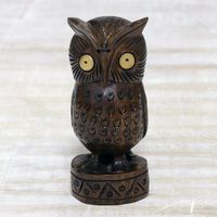 "Relentless guardian of the night and its secrets, an owl stares into the distance with big round eyes. This kadam wood statuette from Dayal J. Daryanani is carved by hand with admirable expertise and treated with an aged finish."