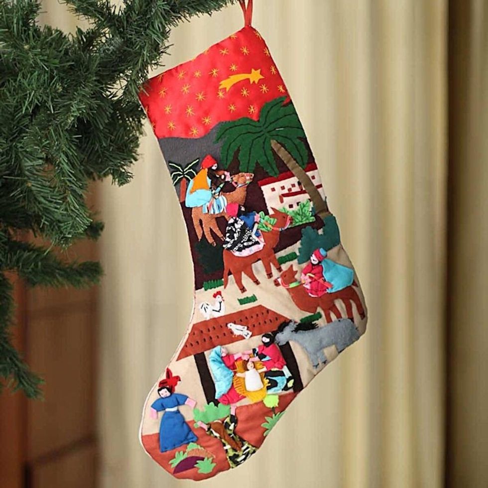 Purchased this stocking for my daughter, a children’s librarian and was so excited to see the details sewn into the stocking. People and creatures of the jungle cover this wonderfully colored stocking. Excellent craftsmanship went into this creation.