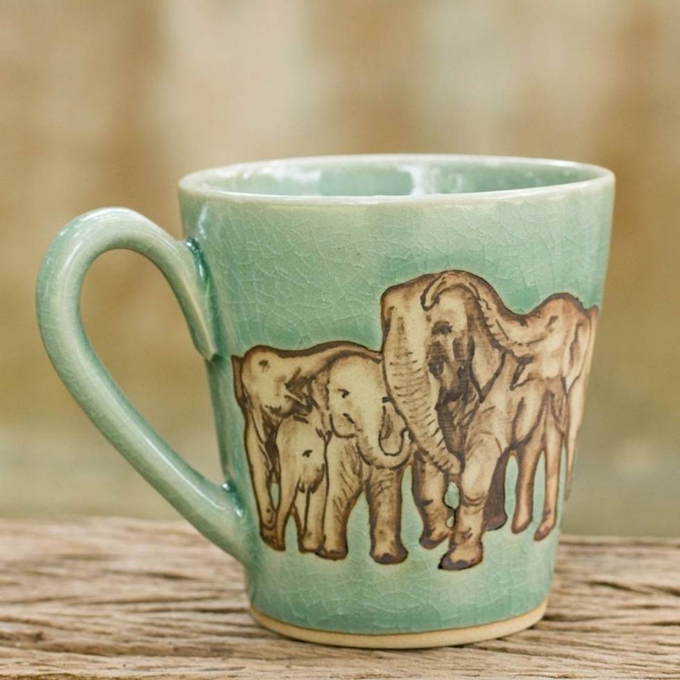 Aqua Celadon Ceramic Mug with Hand Painted Elephants 'Cozy Family' Item ID: 2671802035