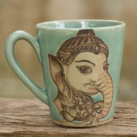 Aqua Celadon Ceramic Mug with Handpainted Ganesh 'Baby Ganesh' Item ID: 2671802495
