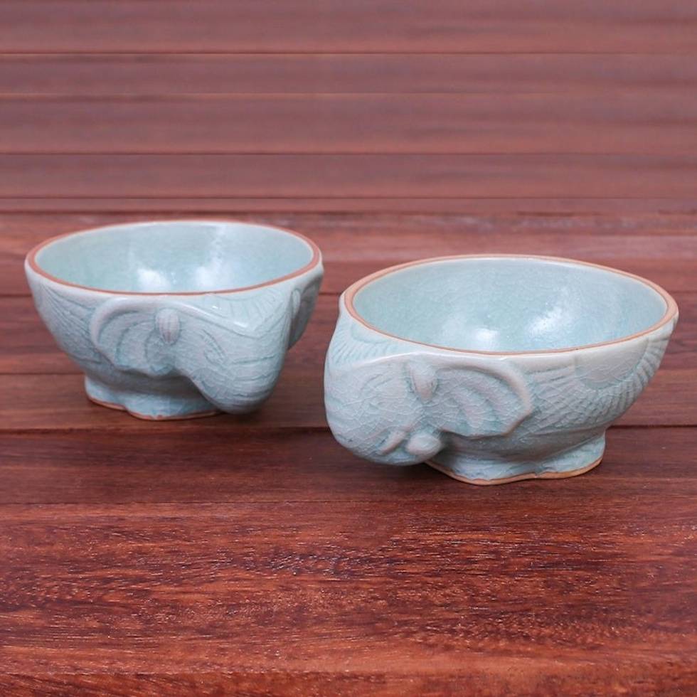 Aqua Elephant Motif Celadon Bowls Pair 'Elephant Companion in Aqua' Item ID: 2671640789