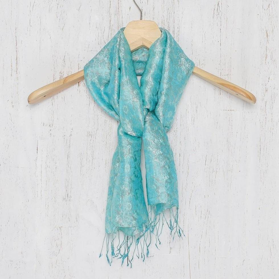 Aqua Floral Pattern Scarf from Thailand 'Aqua Bouquet' Item ID: 2671802015