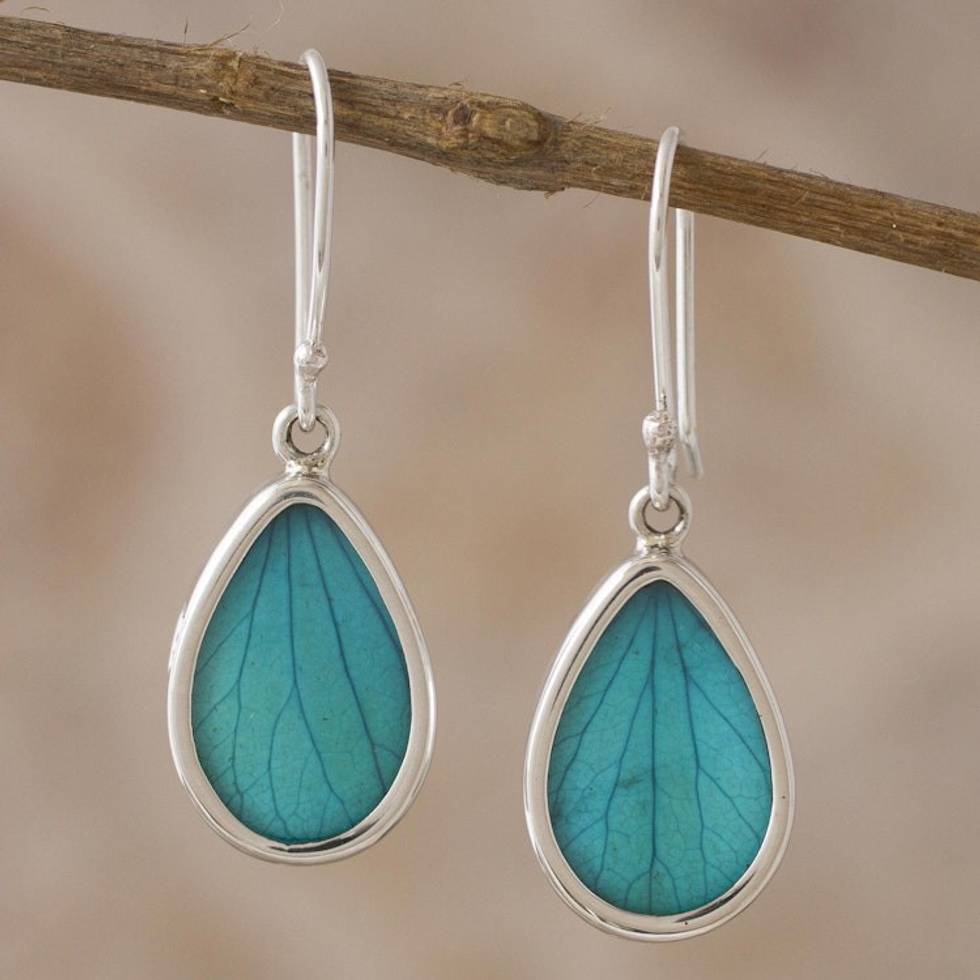 Aqua Hydrangea Leaf Sterling Silver Teardrop Dangle Earrings 'Petal Essence in Aqua' Item ID: 2670659740
