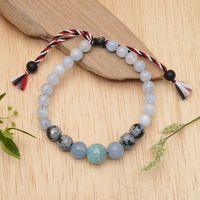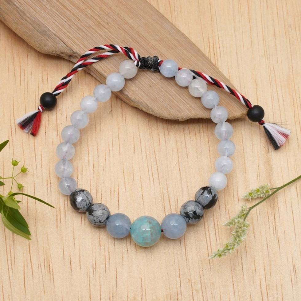"Made Masna's yoga pendant bracelet for men balances soothing aquamarine and obsidian with bold onyx accents on both ends of the adjustable cord. Symbolizing the elements of Balinese Hinduism, the tridatu cords in red, white and black speak to purity, vitality and protection, making this bracelet a meaningful statement."