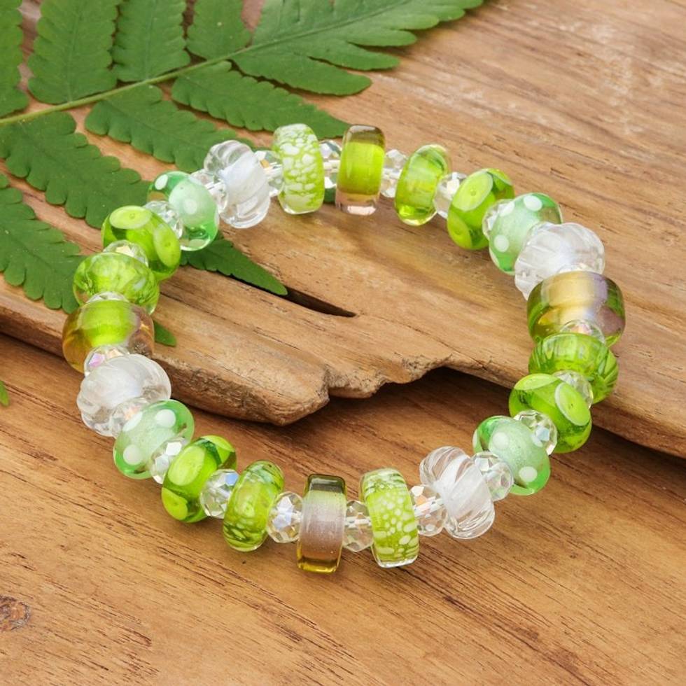 "This lively stretch bracelet is a burst of color for your wrist, featuring handblown glass beads with captivating patterns and dazzling lime green, white, light purple and light brown tones. The unique shapes and textures make each glass bead one-of-a-kind, complemented by clear crystal beads. Thai artisan Alexx Cheng uses traditional techniques to craft a bracelet that feels timeless and effortlessly stylish."
