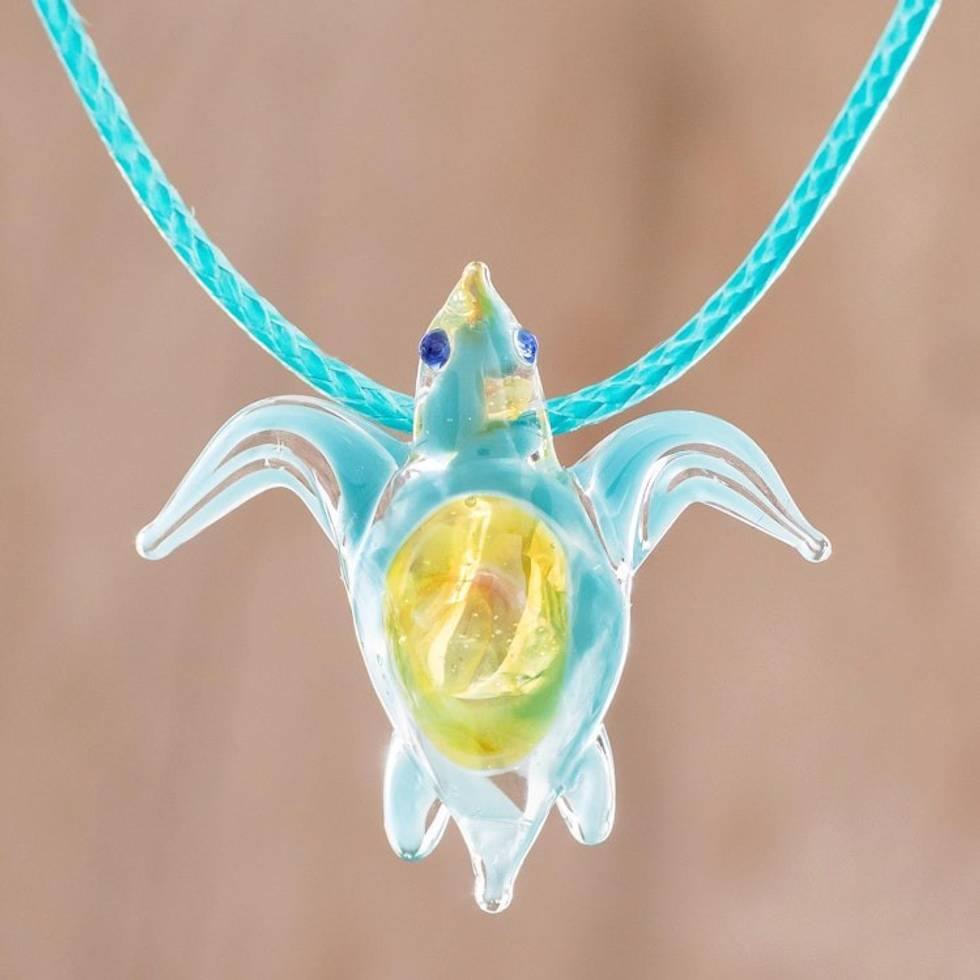Art Glass Sea Turtle Pendant Necklace from Costa Rica 'In the Ocean' Item ID: 2669933763