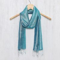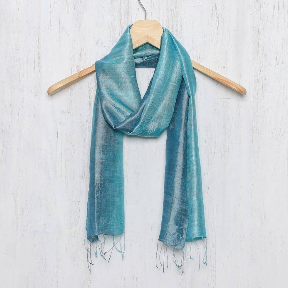Artisan Crafted 100 Silk Teal Wrap Scarf from Thailand 'Peacock Blue' Item ID: 2669892424
