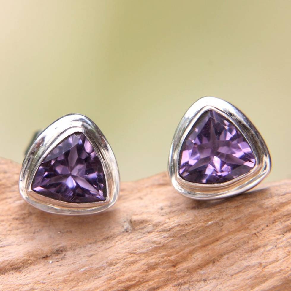 Artisan Crafted Amethyst and Sterling Silver Stud Earrings 'Purple Trinity' Item ID: 2671482113