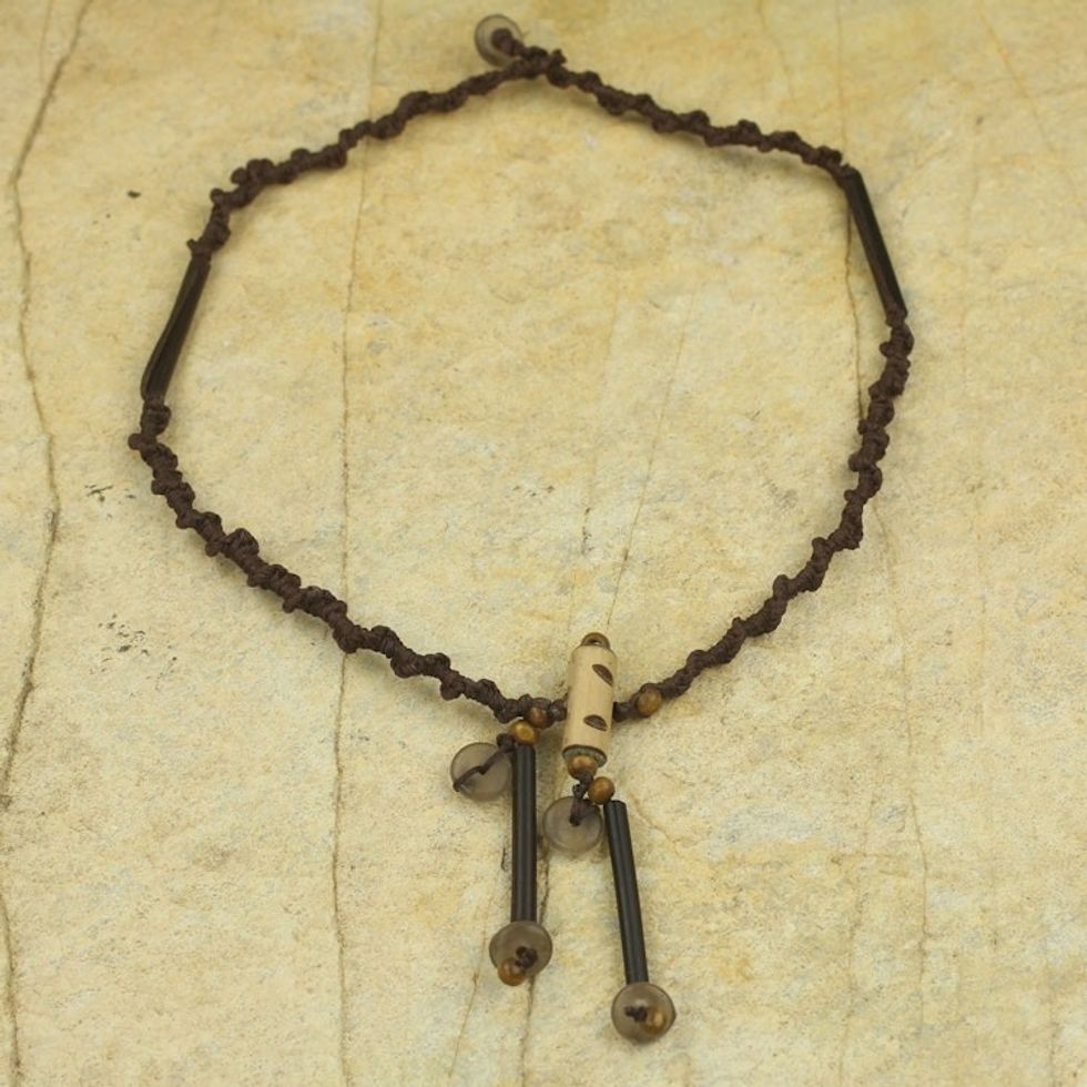 "Knotted by hand with macrame techniques, this necklace is designed to accessorize with African elegance. Nonyem Abena Ibeneme combines beads carved of bamboo and sese wood as well as recycled glass as she crafts the necklace by hand."
