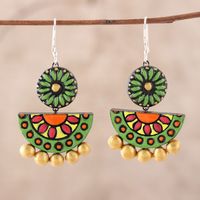 Artisan Crafted Bollywood Ceramic Dangle Earrings from India 'Crescent Flora' Item ID: 2671792134