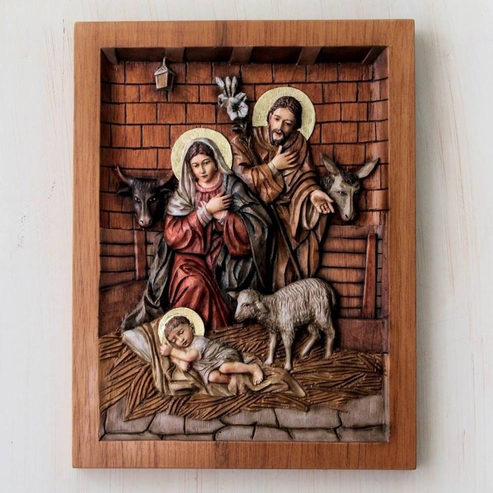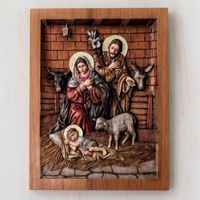 Artisan Crafted Cedar Wood Nativity Scene Relief Sculpture 'In a Stable in Bethlehem' Item ID: 2671608375