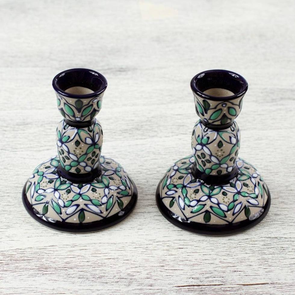Artisan Crafted Ceramic Candlesticks from Mexico Pair 'Green Valley' Item ID: 2669926956