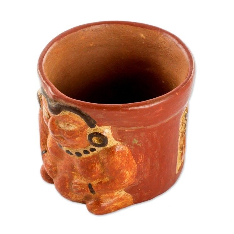 "The richly adorned image of a Maya woman suggests his royal lineage in an original vase from Oscar Rodolfo Mendoza. Detailed in high relief, the ceramic vase is also adorned with traditional motifs attributed to the Maya Pibil people. Little is known about them, other than that the Pibil were a warrior and migrant community that came to El Salvador from Mexico. This jar is treated to achieve an antiqued look, featuring red and orange hues obtained from achiote seeds."