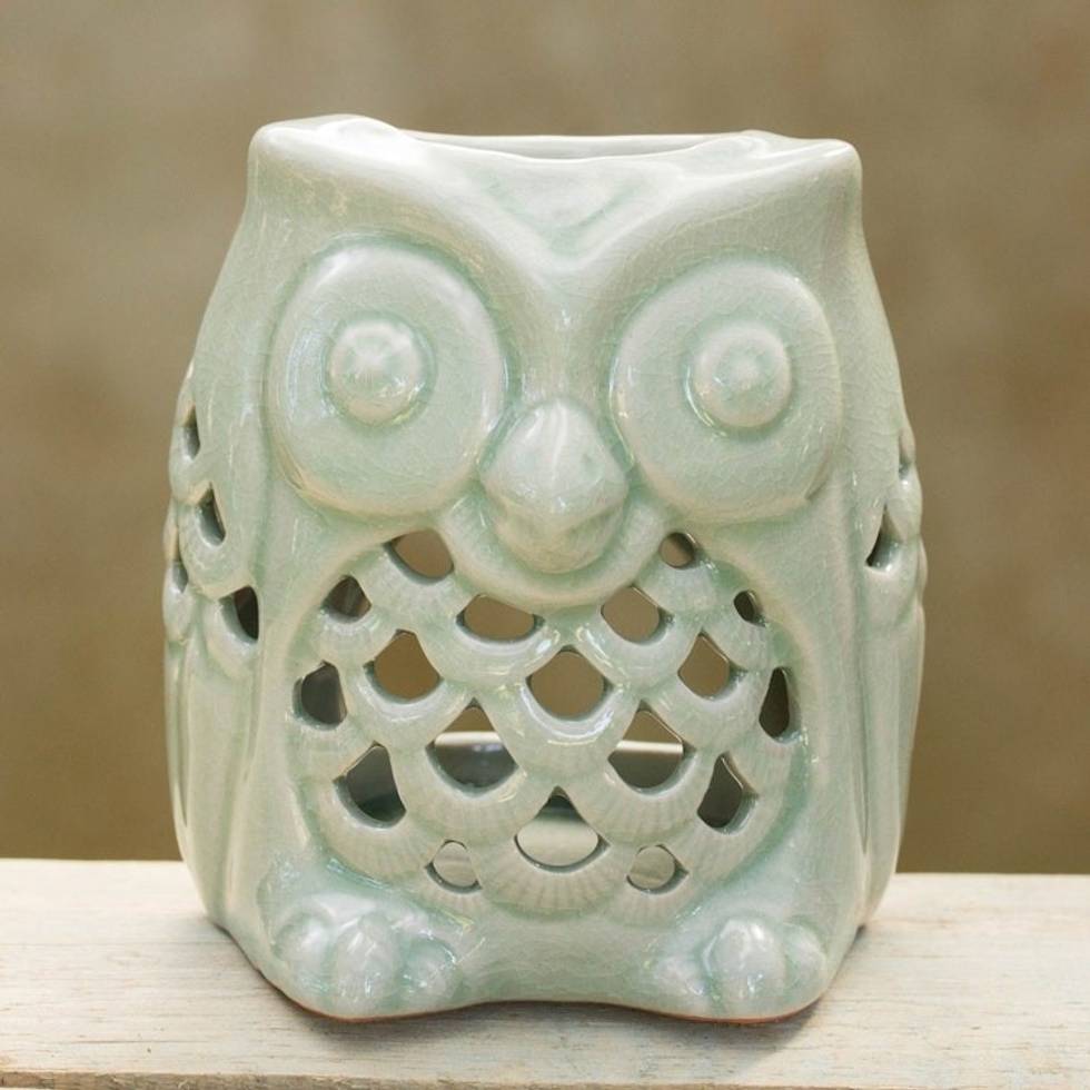 Artisan Crafted Ceramic Owl Oil Warmer from Thailand 'Cozy Owl in Green' Item ID: 2671802201