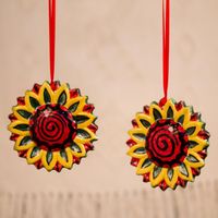 Artisan Crafted Ceramic Sunflower Ornaments Pair 'Holiday Sunflowers' Item ID: 2671808277