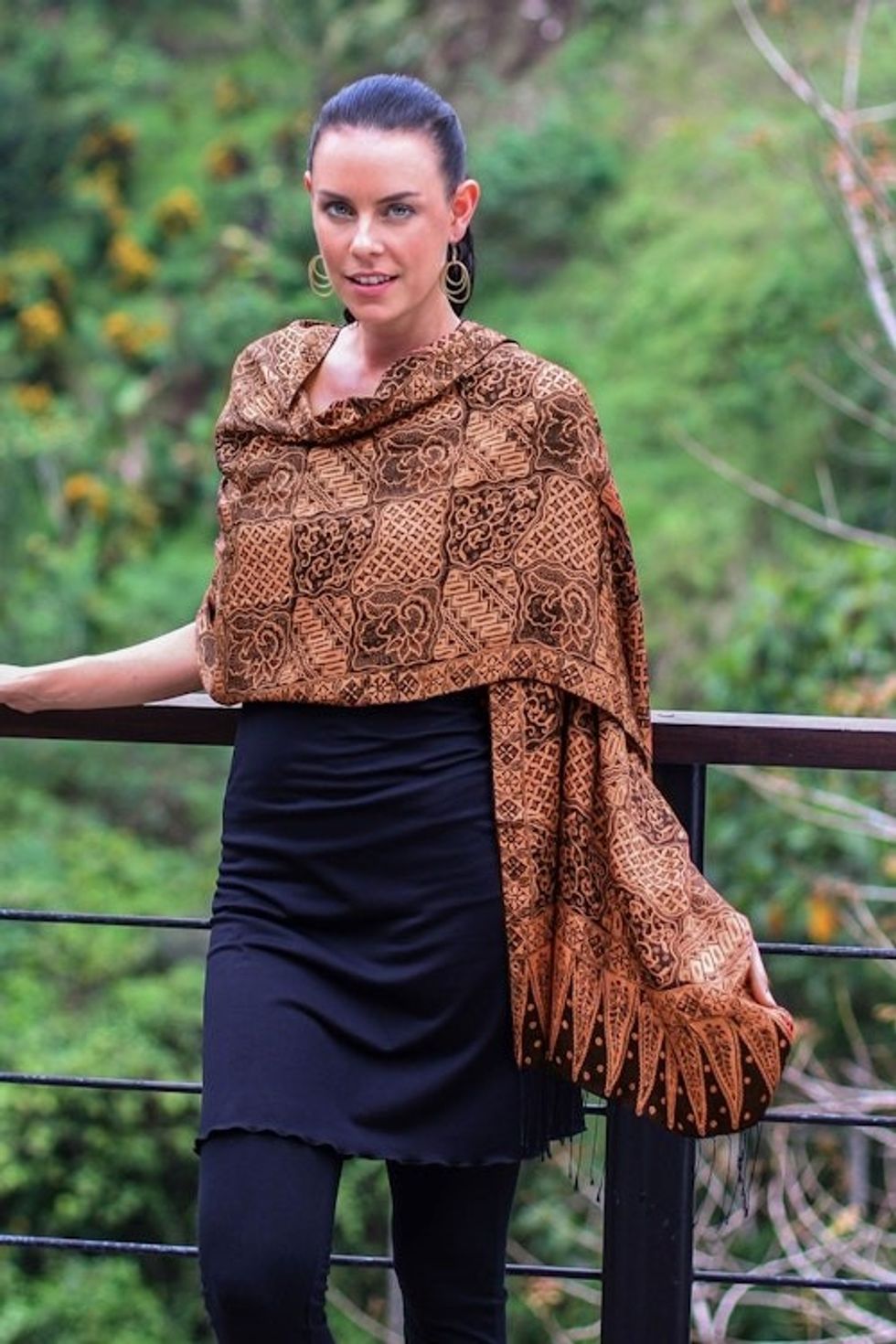 This absolutely gorgeous shawl is made from some of the finest silk I've ever had the privilege to touch. It is so soft and light, yet sturdy and the batikking is impeccable! I love the black version, as it shows up the print so beautifully! It almost has a vintage Arts and Crafts feel to the pattern. Nice enough to display in one's home - the bedroom perhaps...? I have since thought of getting another color either for myself or a very good friend or family member...well worth it.