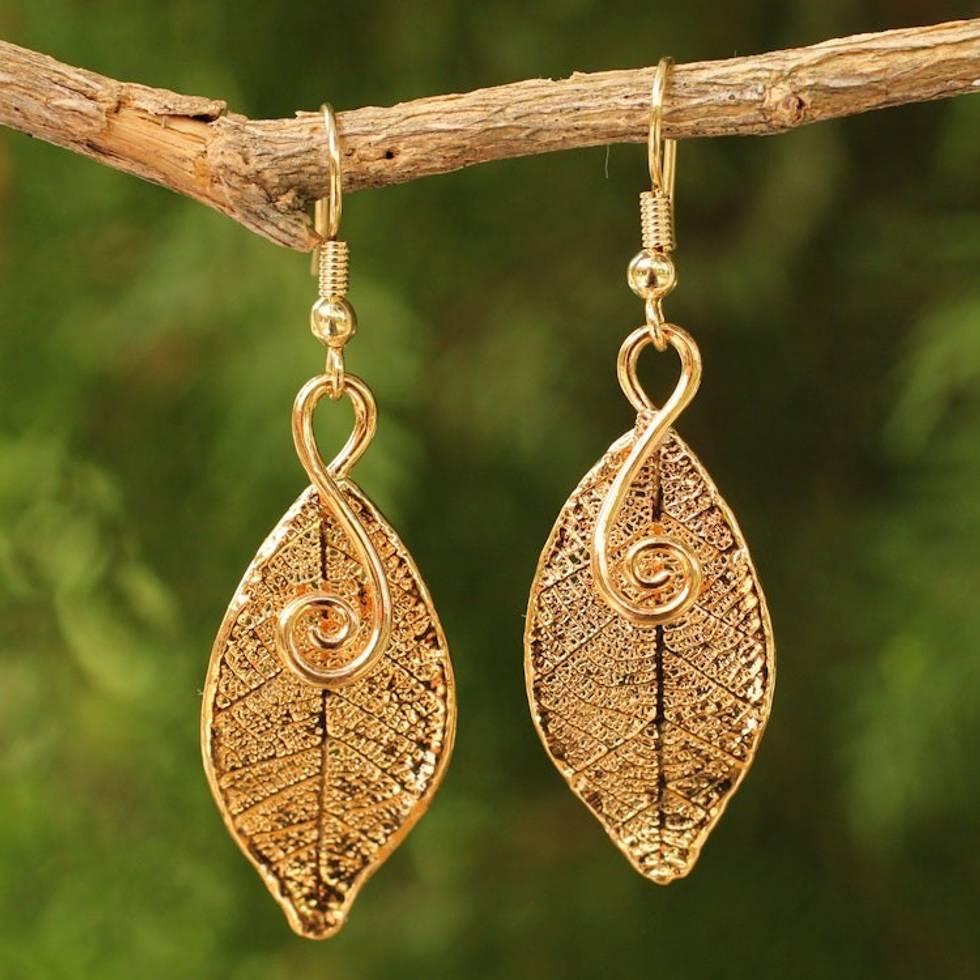 Artisan Crafted Gold Plated Leaf Earrings 'Forest Duet' Item ID: 2671802697