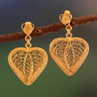 Artisan Crafted Heart Shaped Gold Filigree Earrings 'Lace Sweetheart' Item ID: 2671400096