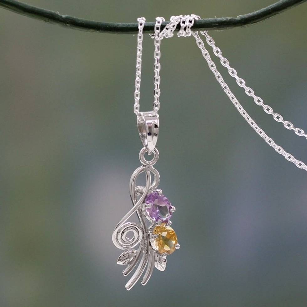Artisan Crafted India Necklace with Amethyst and Citrine 'Tropical Bouquet' Item ID: 2671793615