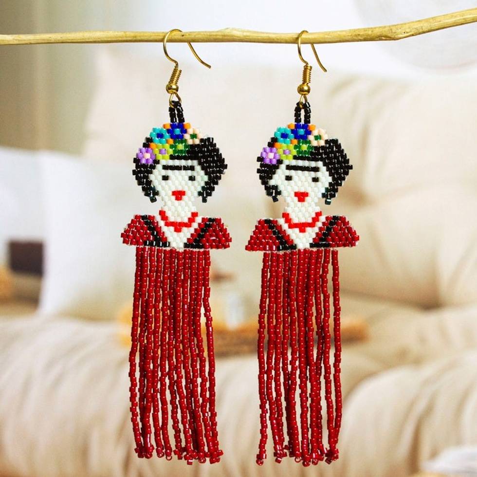 Artisan Crafted Long Beaded Earrings 'Frida Forever' Item ID: 2671807638