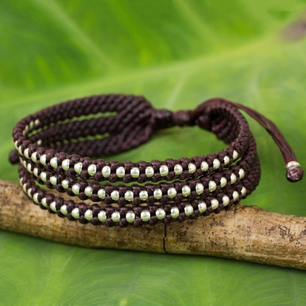 Artisan Crafted Maroon Wristband Bracelet with Silver Beads 'Dark Maroon Synergy' Item ID: 2671802001
