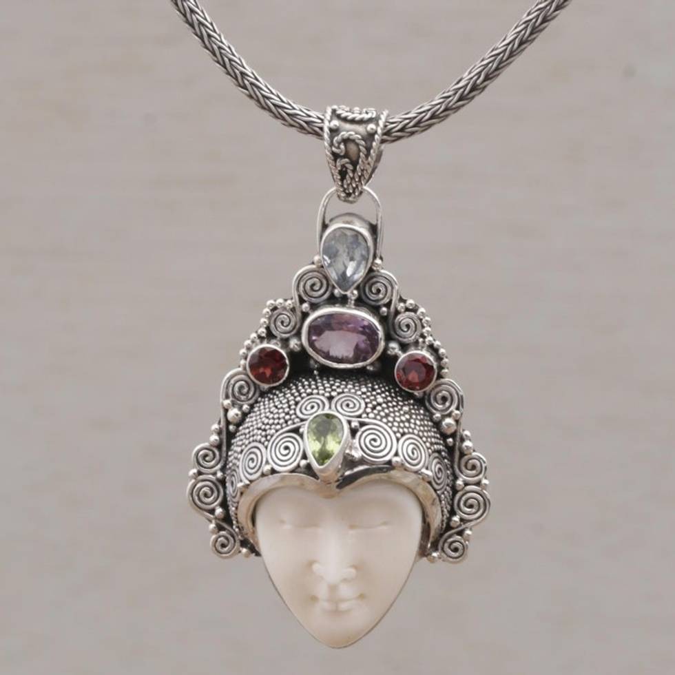 Artisan Crafted Multi-Gem Face Pendant Necklace from Bali 'Jeweled Knight' Item ID: 2671732776