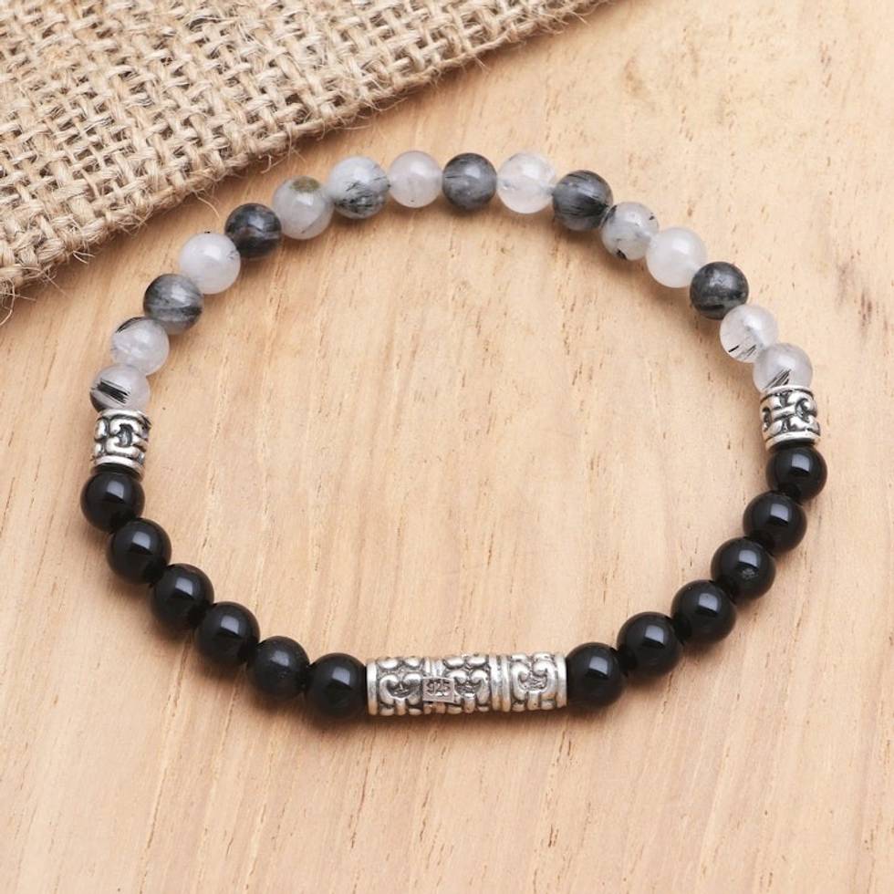 Artisan Crafted Onyx and Quartz Beaded Bracelet 'Smoky Skies' Item ID: 2671745101