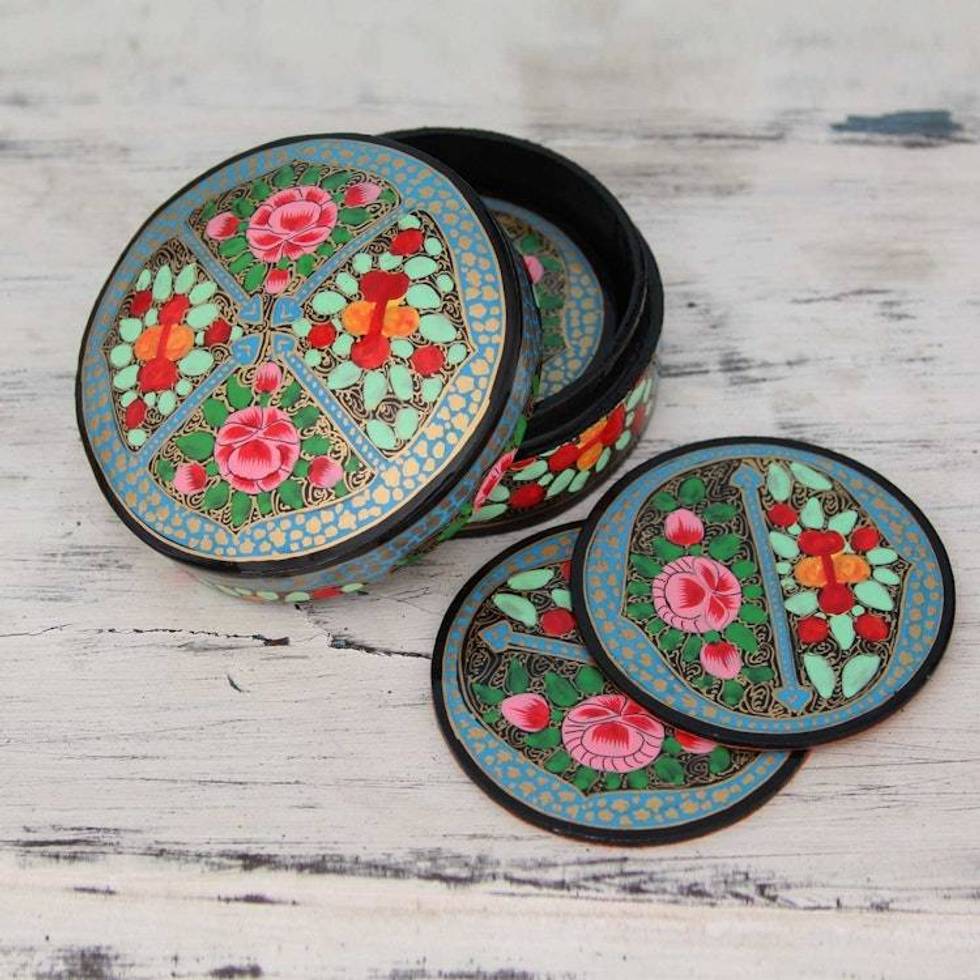 Artisan Crafted Papier Mache Coasters with Holder Set of 6 'Kashmir Floral' Item ID: 2676663830