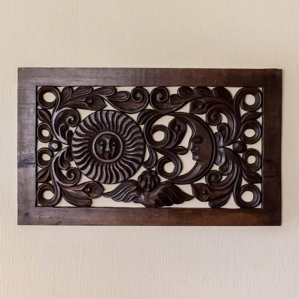 "Crafted by hand from pinewood, this rich-toned wall panel with a rustic finish is a fascinating addition to your home decor. Chico Mendoza of Guatemala depicts the sun and moon rising above an angel surrounded by a sinuous floral motif in this stunning piece."