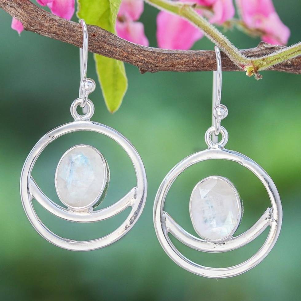 Artisan Crafted Rainbow Moonstone Dangle Earrings 'Grinning Moon in Blue Flash' Item ID: 2671799694