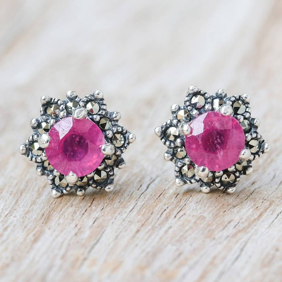 Artisan Crafted Ruby and Marcasite Stud Earrings 'Firefly in Pink' Item ID: 2669926646