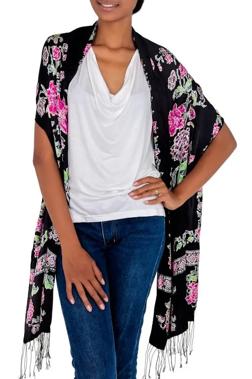 Artisan Crafted Silk Batik Shawl from Bali 'Sweet Night Blossoms' Item ID: 2671820956