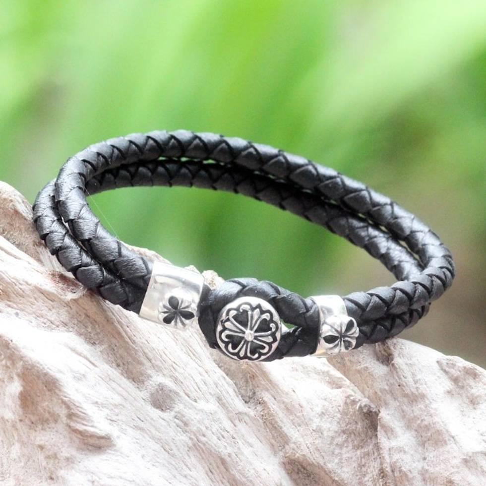 Artisan Crafted Silver and Leather Bracelet 'Lotus in Black' Item ID: 2671698537