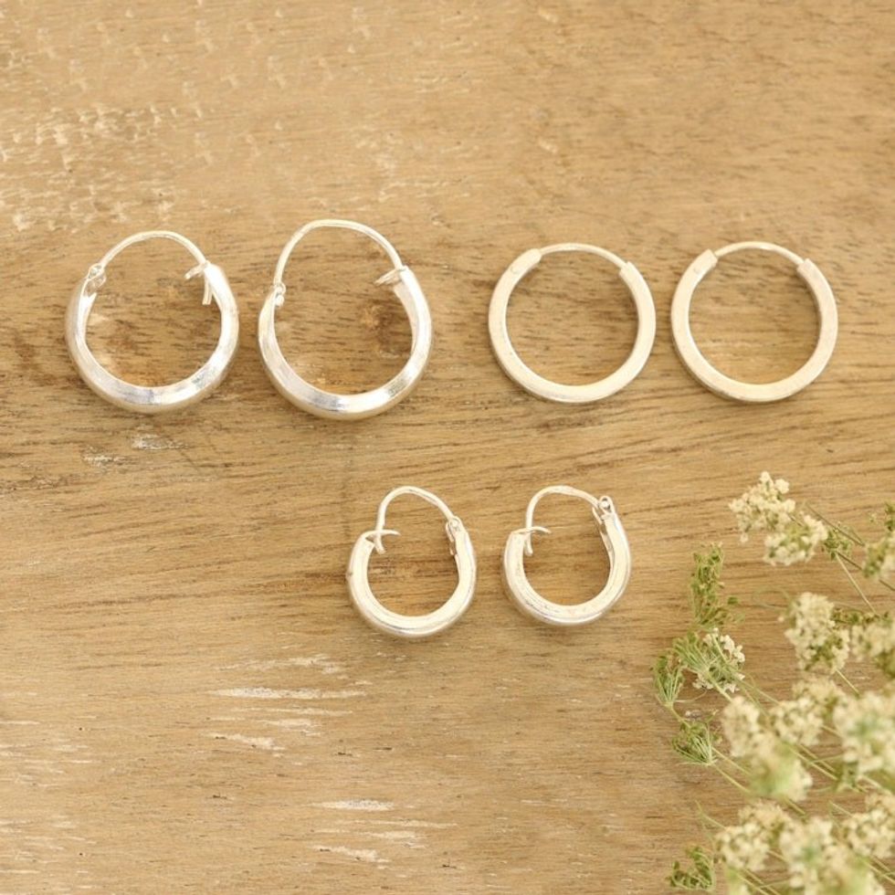 Artisan Crafted Sterling Silver Hoop Earrings Set of 3 'Lustrous Loops' Item ID: 2671625462