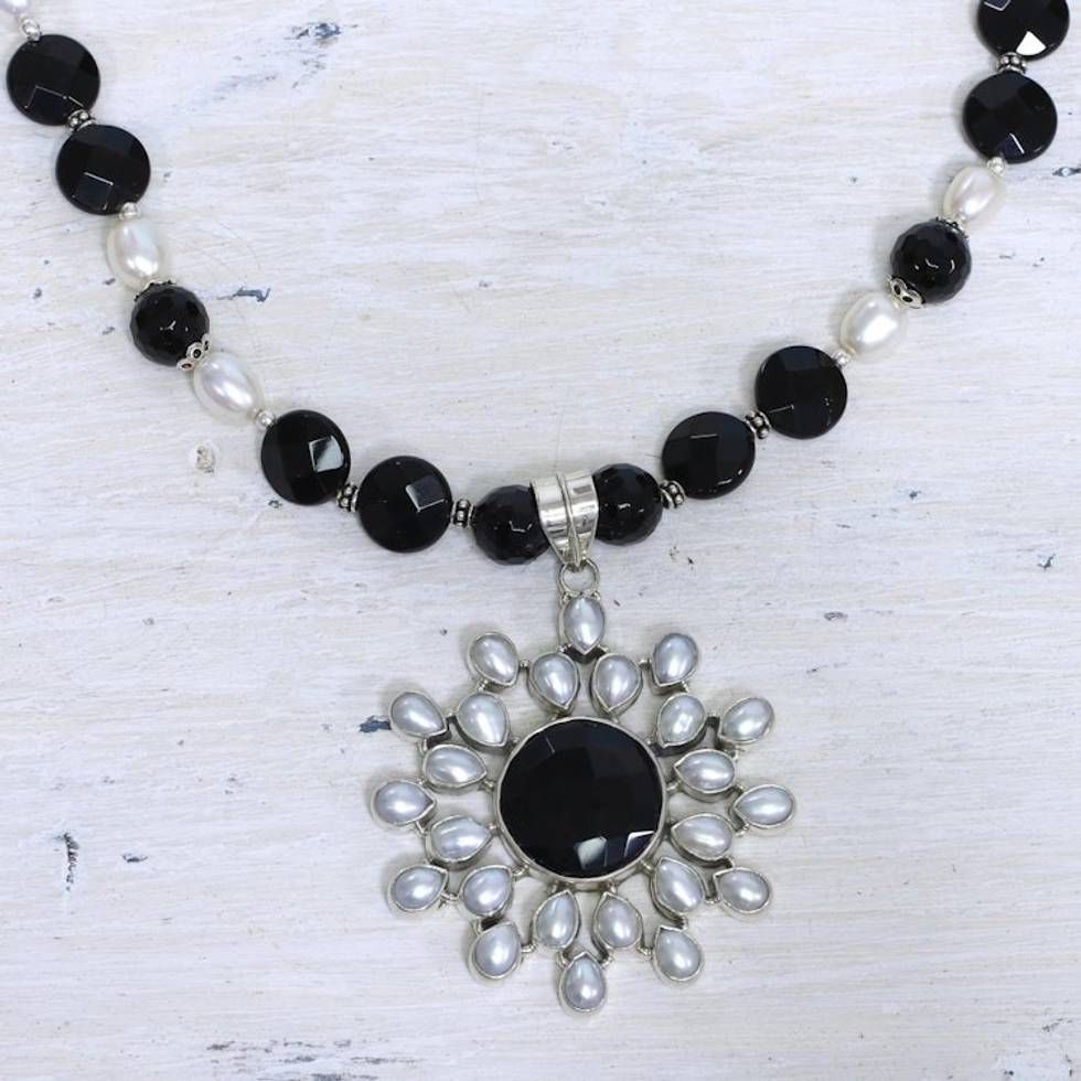 Artisan Crafted Sterling Silver Pearl and Onyx Necklace 'Facets' Item ID: 2671794450
