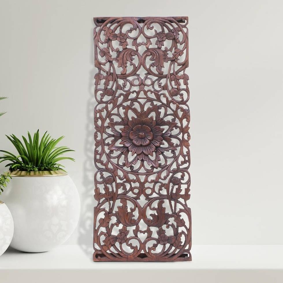 Artisan Crafted Teak Wood Relief Panels Set of 3 'Lotus Charm' Item ID: 2671800139