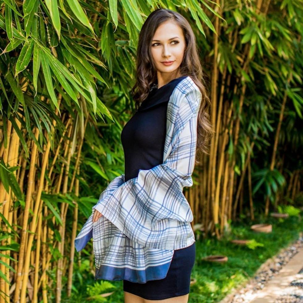 Artisan Crafted Thai Silk Blend Shawl in Grey on White 'Grey Plaid Batik' Item ID: 2671802186